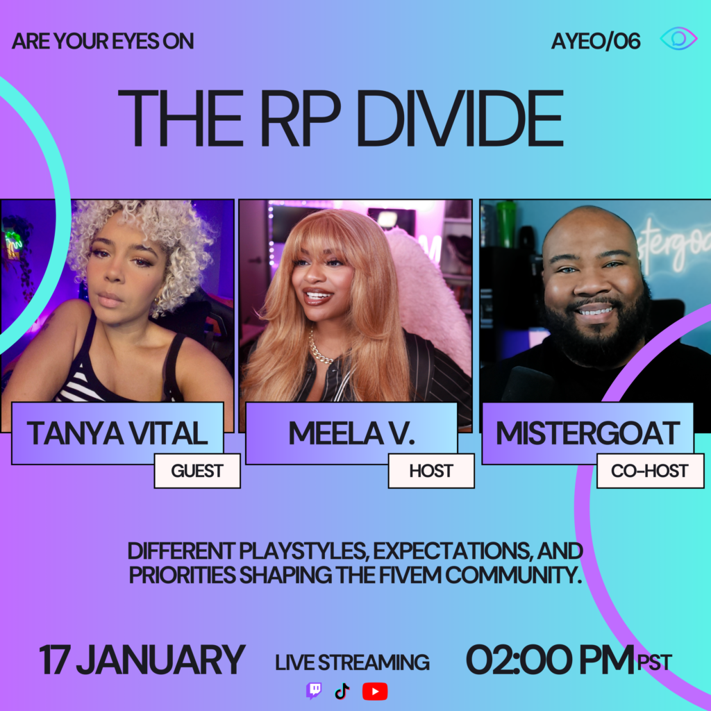 In Episode 6 of Are Your Eyes On, Tanya joins Meela Vanderbuilt and MisterGOAT for a wide-ranging conversation on the evolving definition of roleplay in FiveM—exploring performance vs. collaboration, audience influence, and the growing fragmentation of RP communities.